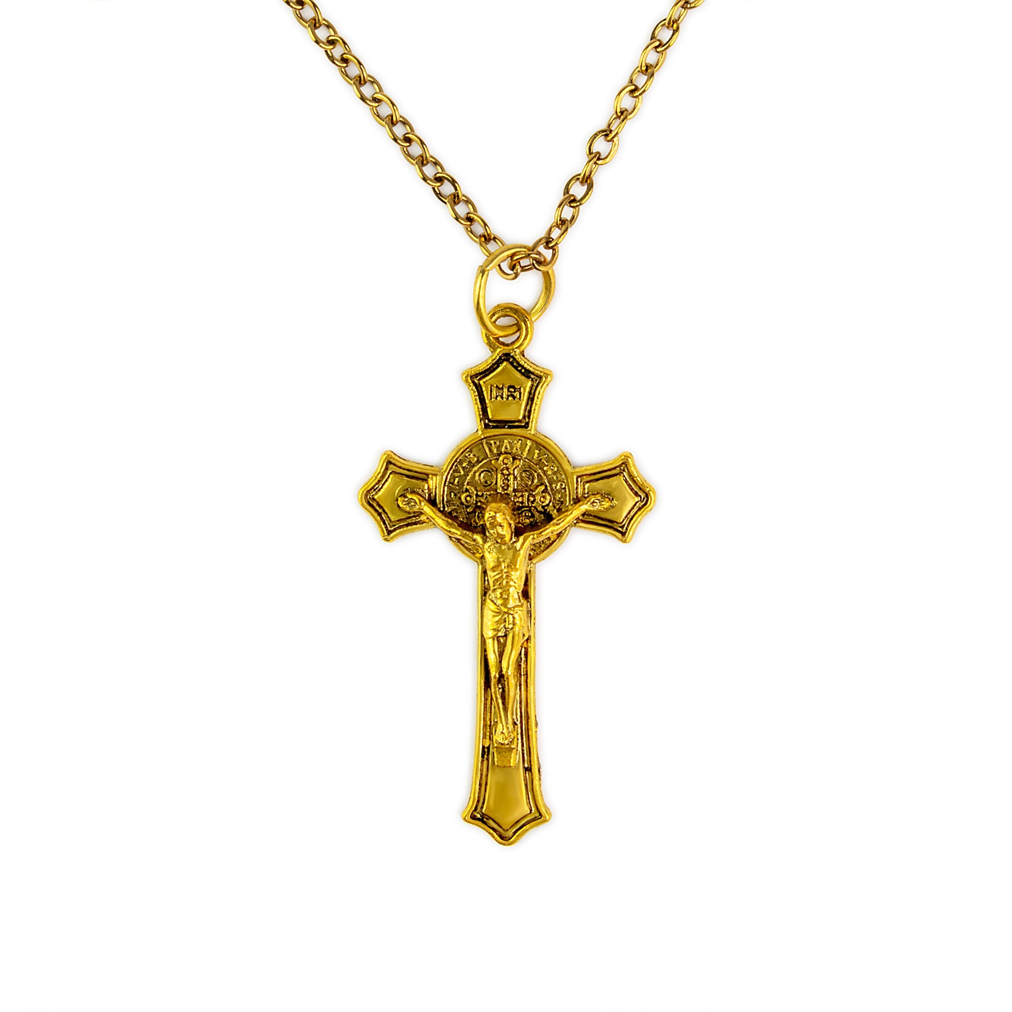 Carry a timeless symbol of faith with these meaningful pendants. The Saint Benedict Crucifix combines the traditional cross with the embedded Saint Benedict Medal. The pendant is packaged in a hangable poly bag and includes a a card explaining the significance of its design.
