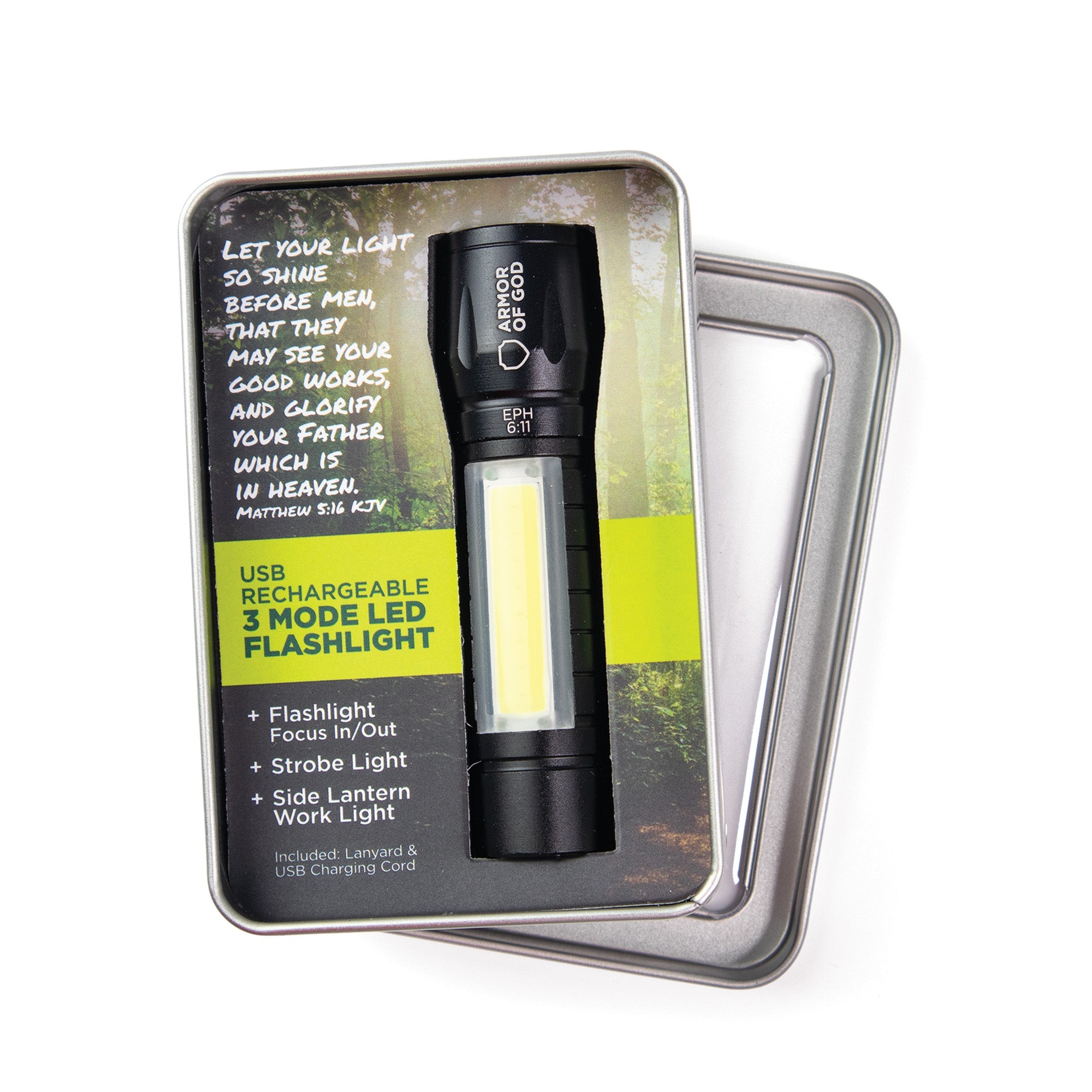 Armor of God, Eph 6:11 - USB Rechargeable 3 Mode LED Flashlight in Tin Box