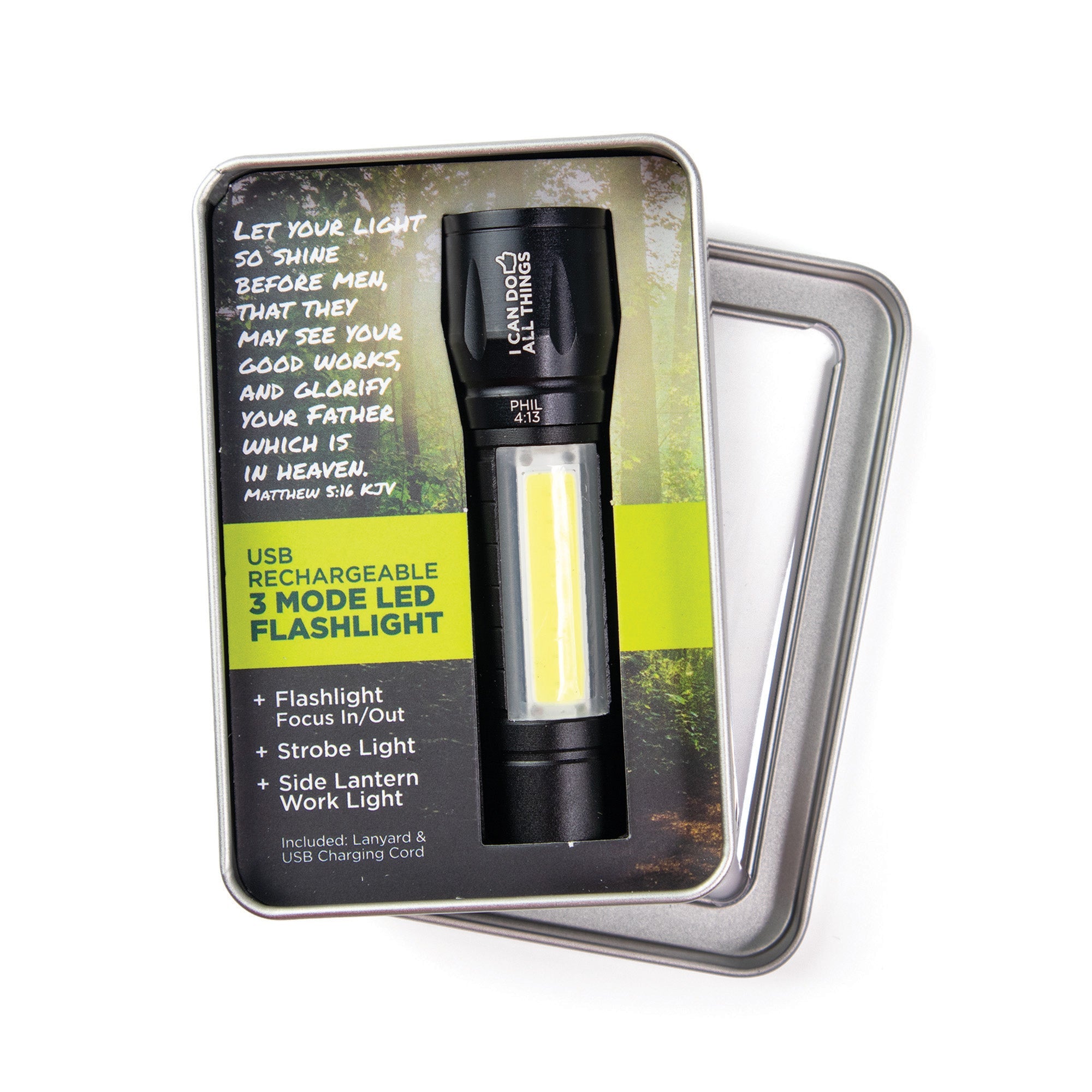 3 Mode LED Scripture Flashlight – I Can Do All Things, Phil 4:13 Light up the darkness with these USB Rechargeable 3 Mode LED Flashlights. Each flashlight is packaged in a tin box with a...