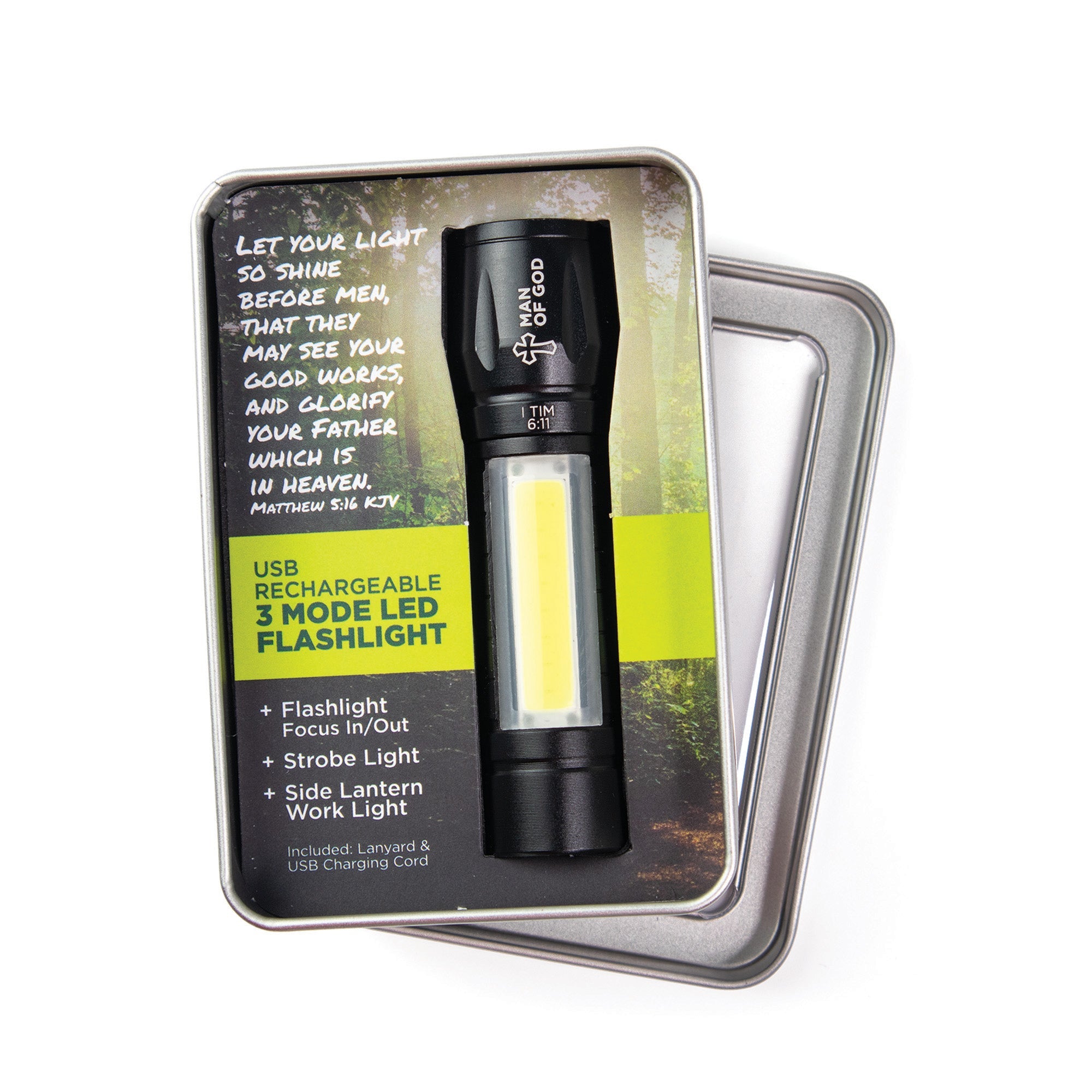 Man of God, 1 Tim 6:11 - USB Rechargeable 3 Mode LED Flashlight in Tin Box