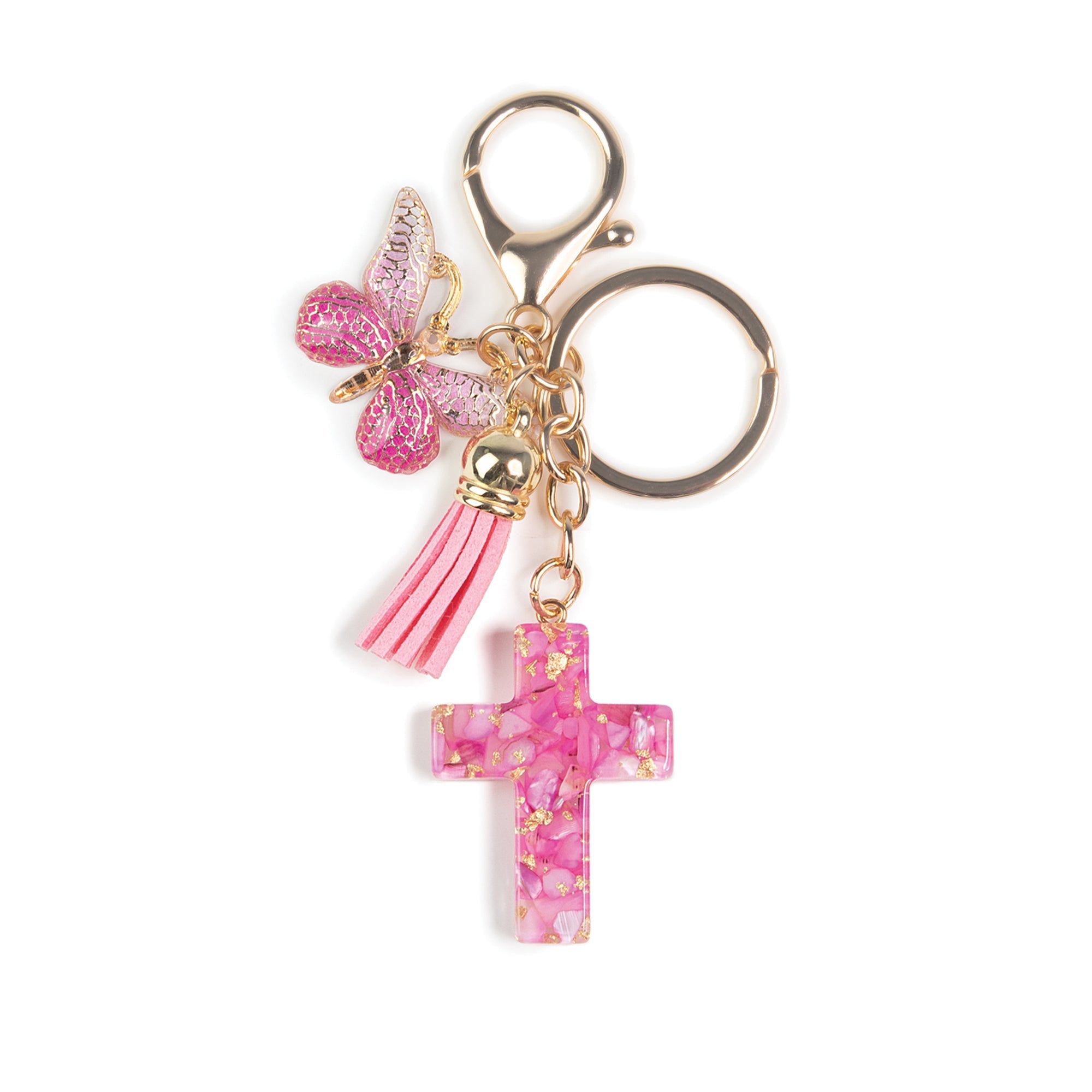 These colorful Cross Charm Key Rings are the perfect accessory for your keys or purse. Each key ring features a beautiful resin cross and butterfly. Attach the key ring with the lobster clasp or ring.