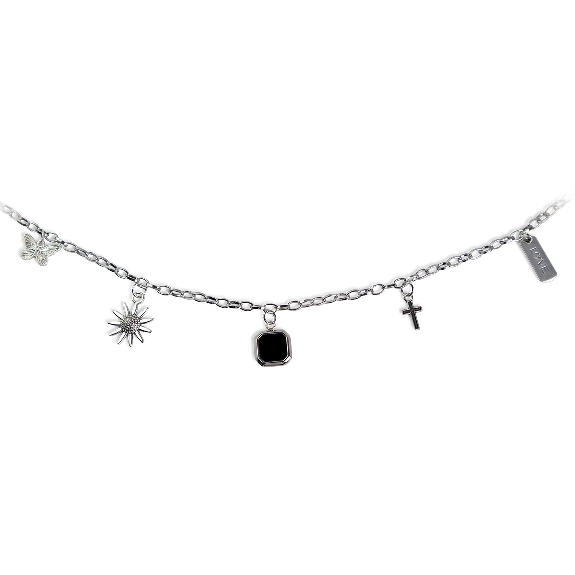 Personalize your Bible with this silver-colored stainless steel Bible Charm chain featuring oval links and five unique charms. The standard charms included a butterfly, a sun, a cross, and a tag with the word "Love". The center charm contains the Logos Tap NFC chip so you have quick access to a scripture, devotional and prayer anytime you need it.