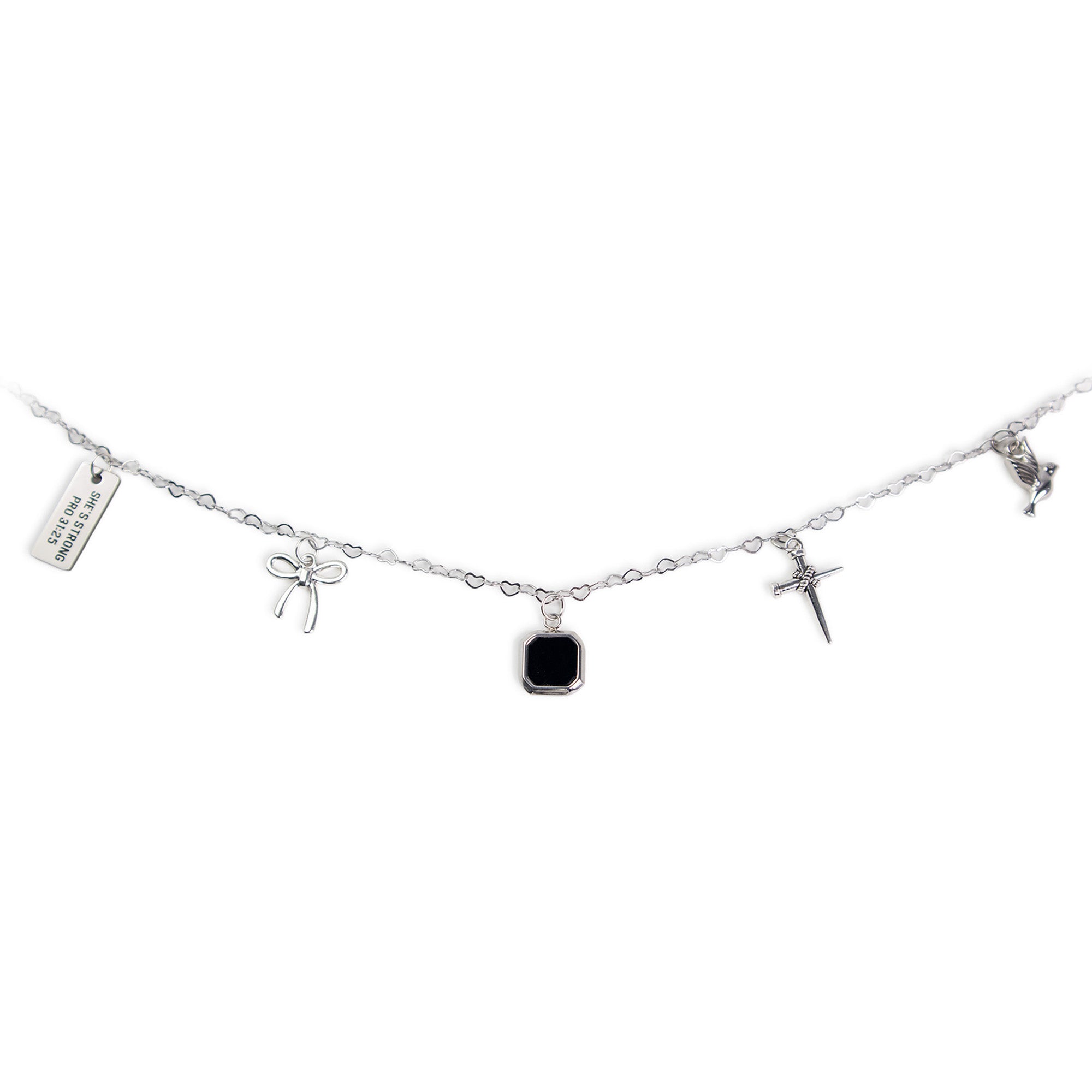 Personalize your Bible with this silver-colored stainless steel Bible Charm chain featuring heart shaped links and five unique charms. The standard charms included a tag with the words "She's Strong Pro 31:25", a bow, a cross made of nails, and a dove. The center charm contains the Logos Tap NFC chip so you have quick access to a scripture, devotional and prayer anytime you need it.