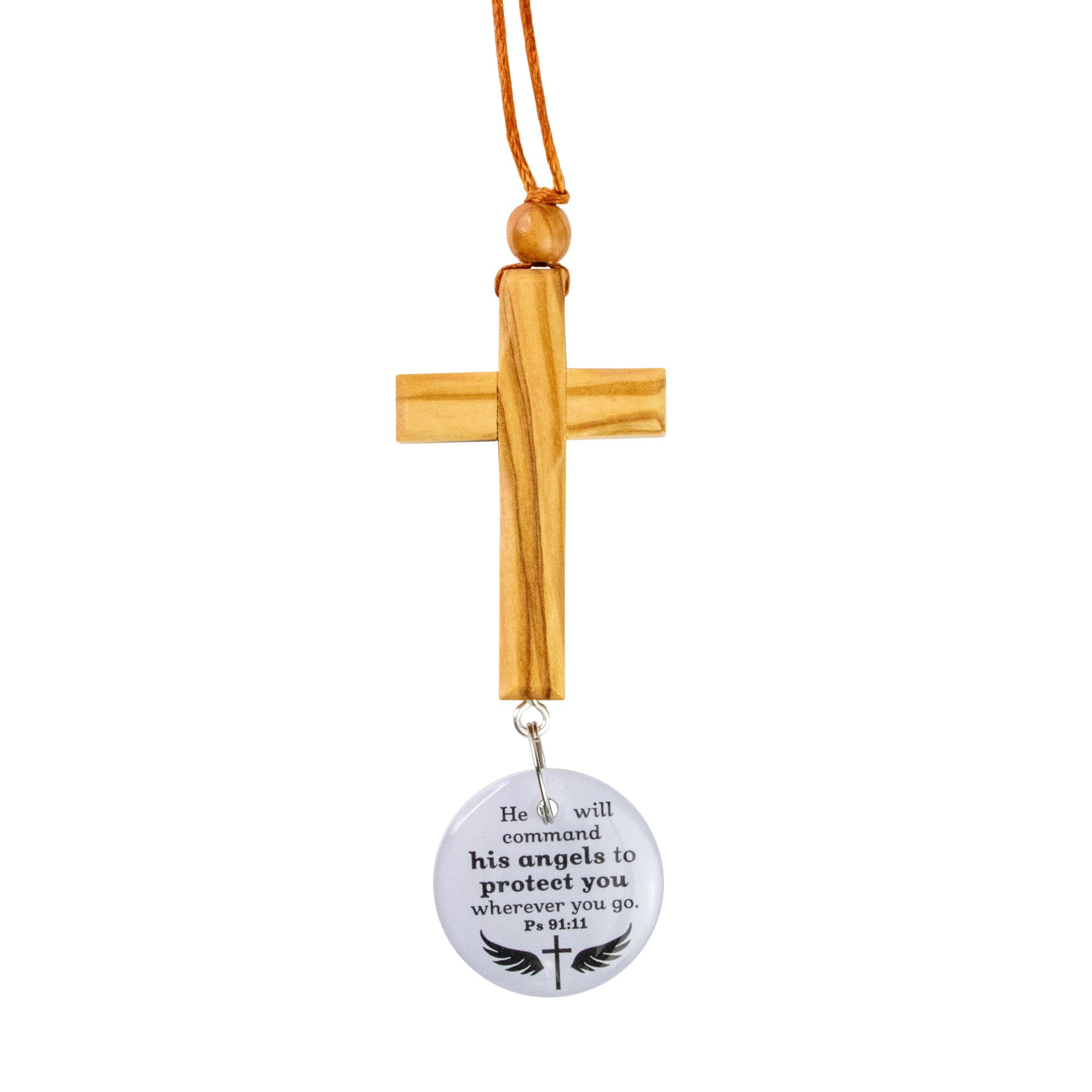 These Holy Land, Olive Wood Cross Car Pendants feature an adjustable cord so you can place it in a safe location in your vehicle. The bottom disc contains the integrated NFC chip that gives you quick access to a scripture, devotional and prayer anytime you need it. The two sided design features a cross and wings icon and the text, "He will command his angels to protect your wherever you go. Ps 91:11".