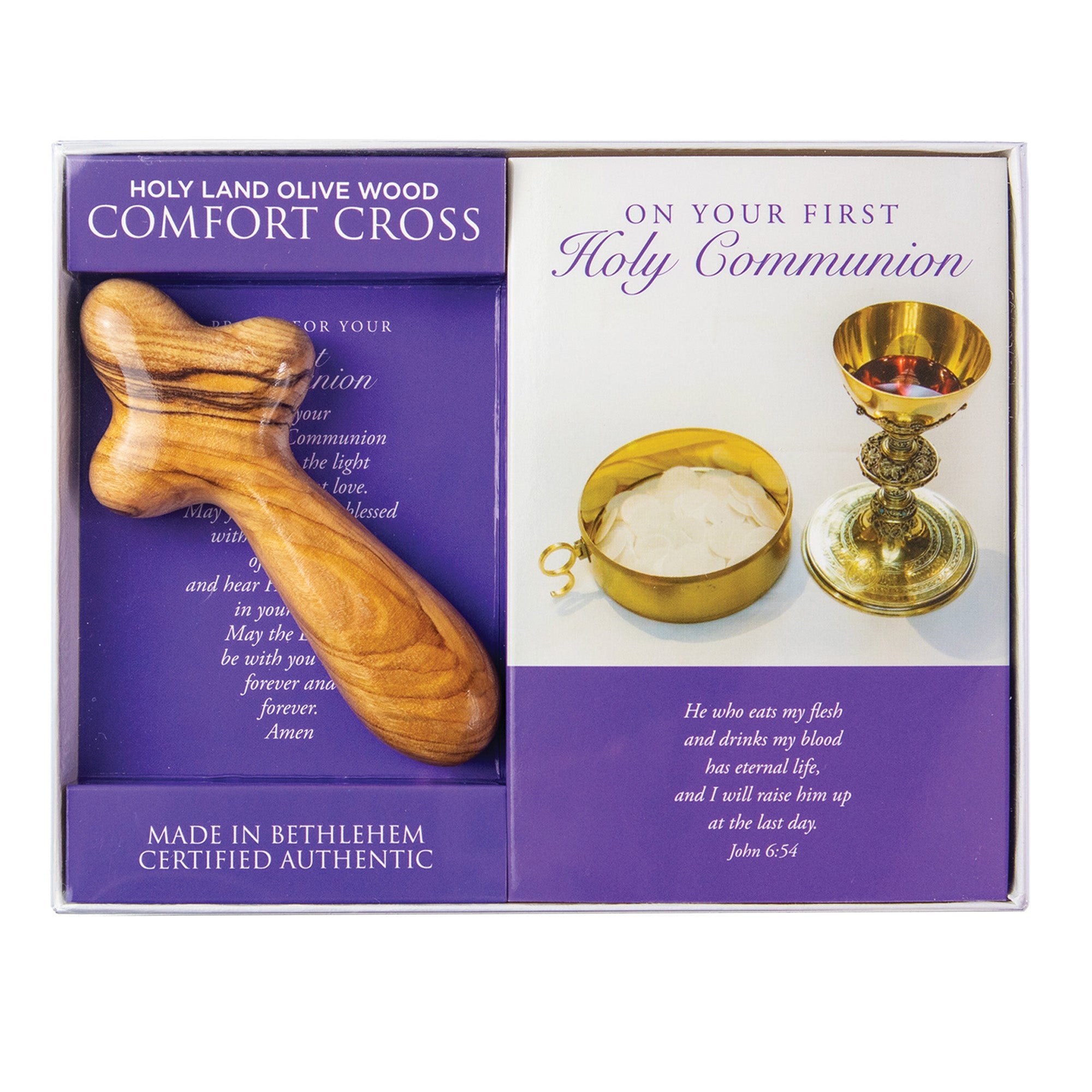 Medium Deluxe Comfort Cross in Box – First Communion Gift This handheld comfort cross is hand crafted from beautifully grained olive wood in the Holy Land of Bethlehem. Each comfort cross is made with softly...