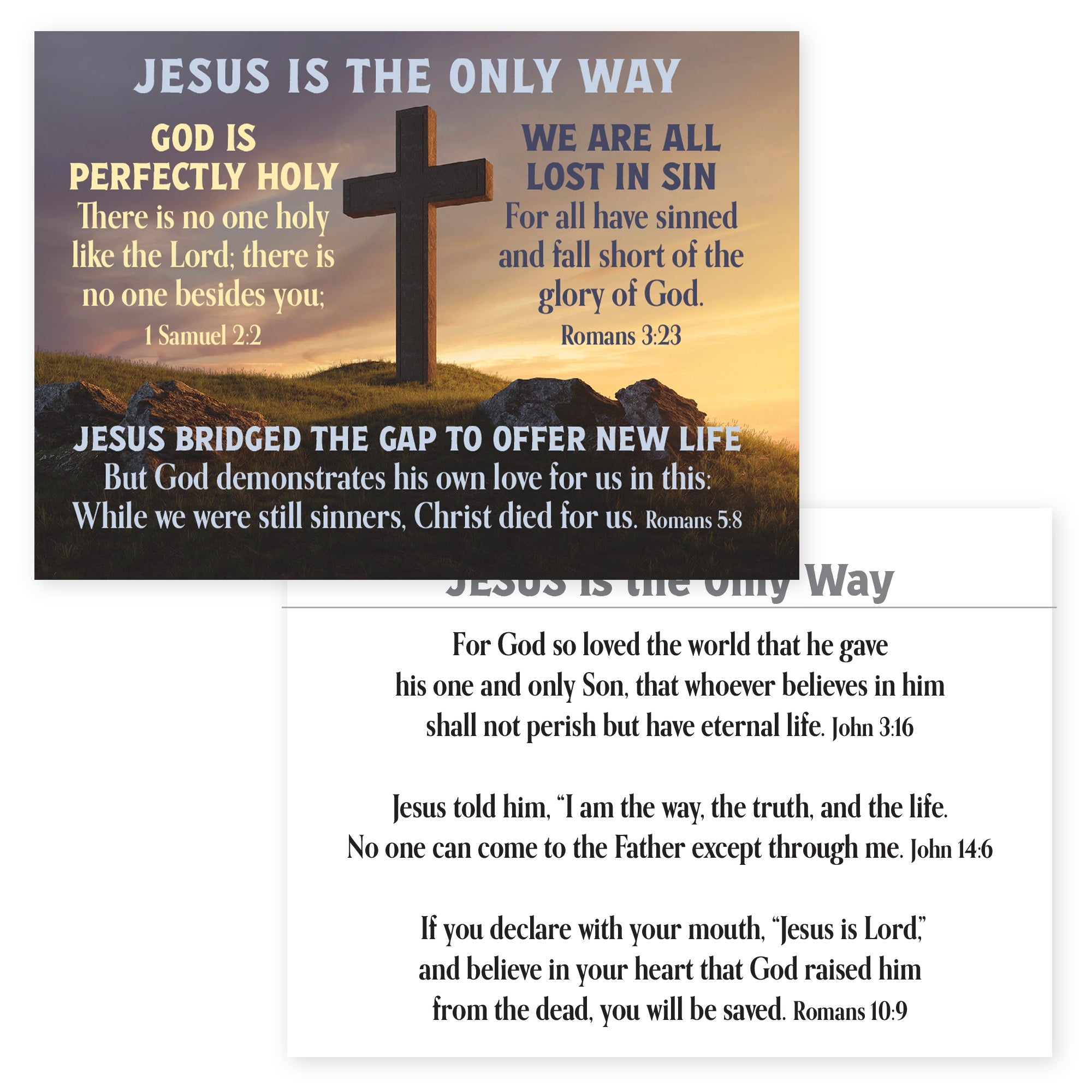 Front: "Jesus is the Only Way. God is Perfectly Holy. There is no one holy like the Lord; there is no one besides you; 1 Samuel 2:2; We Are All Lost in Sin. For all have sinned and fall short of the glory of God. Romans 3:23; Jesus Bridged the Gap to Offer New Life. But God demonstrates his own love for us in this: While we were still sinners, Christ died for us. Romans 5:8"