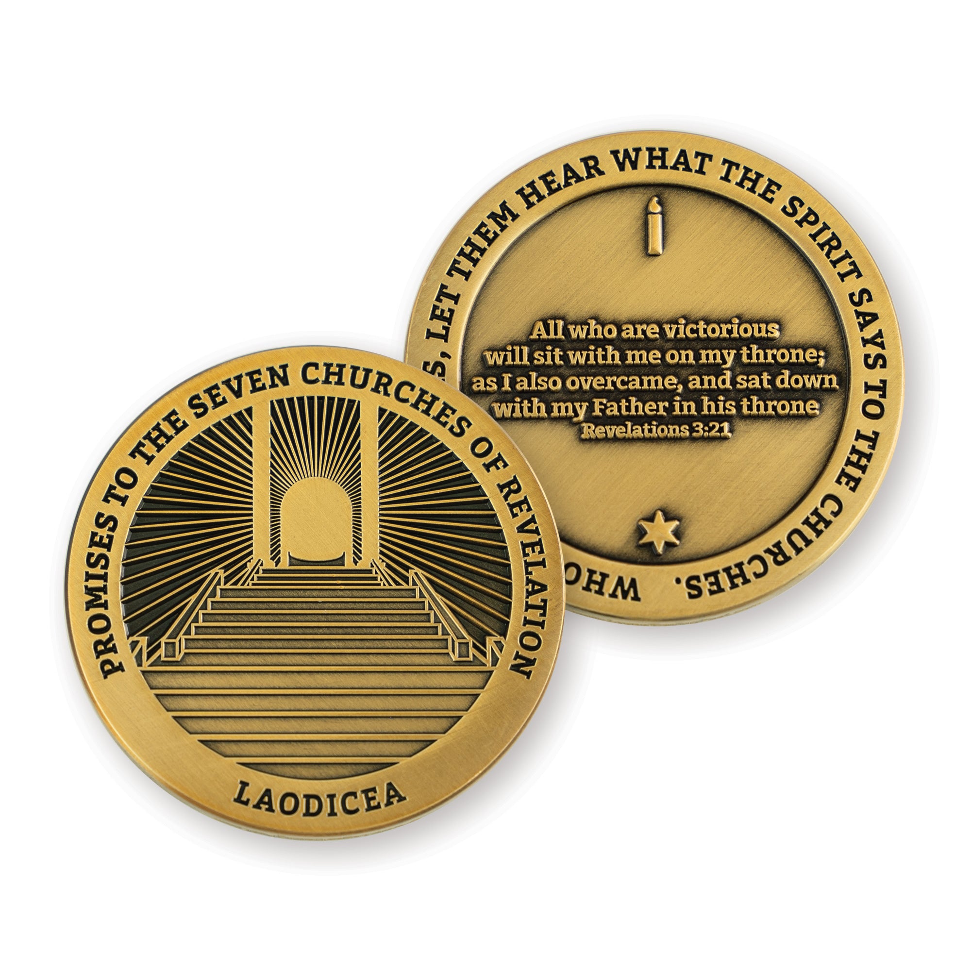 This collectible Laodicea antique gold plated challenge coin is representative of the promises made to the Seven Churches of Revelations. It is meant to help remind you that we are running a race, and every race has an end. Always be ready to test your faith in the light of scripture. Collect the complete set of all seven churches!