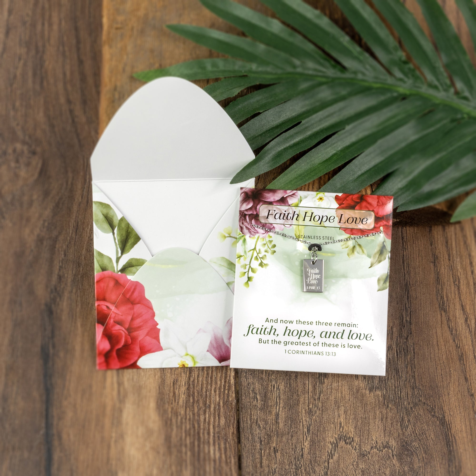 The Faith Hope Love Tag Pendant includes an 18” stainless steel chain with a 2” extender. Each pendant is packaged with a gift card and matching envelope, making these pendants the perfect gift.