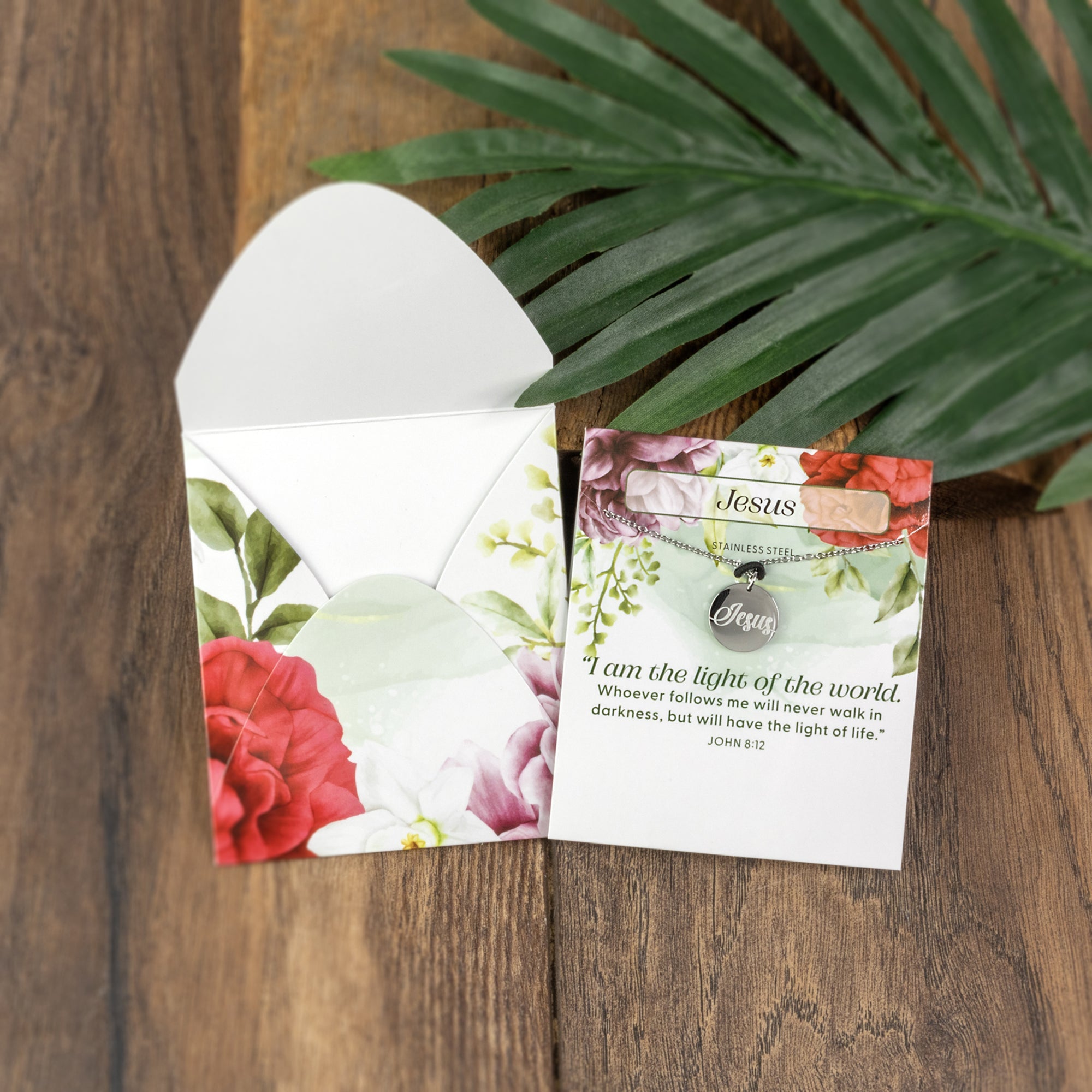 Pendant Front reads "Jesus"; Pendant Back reads "John 8:12"