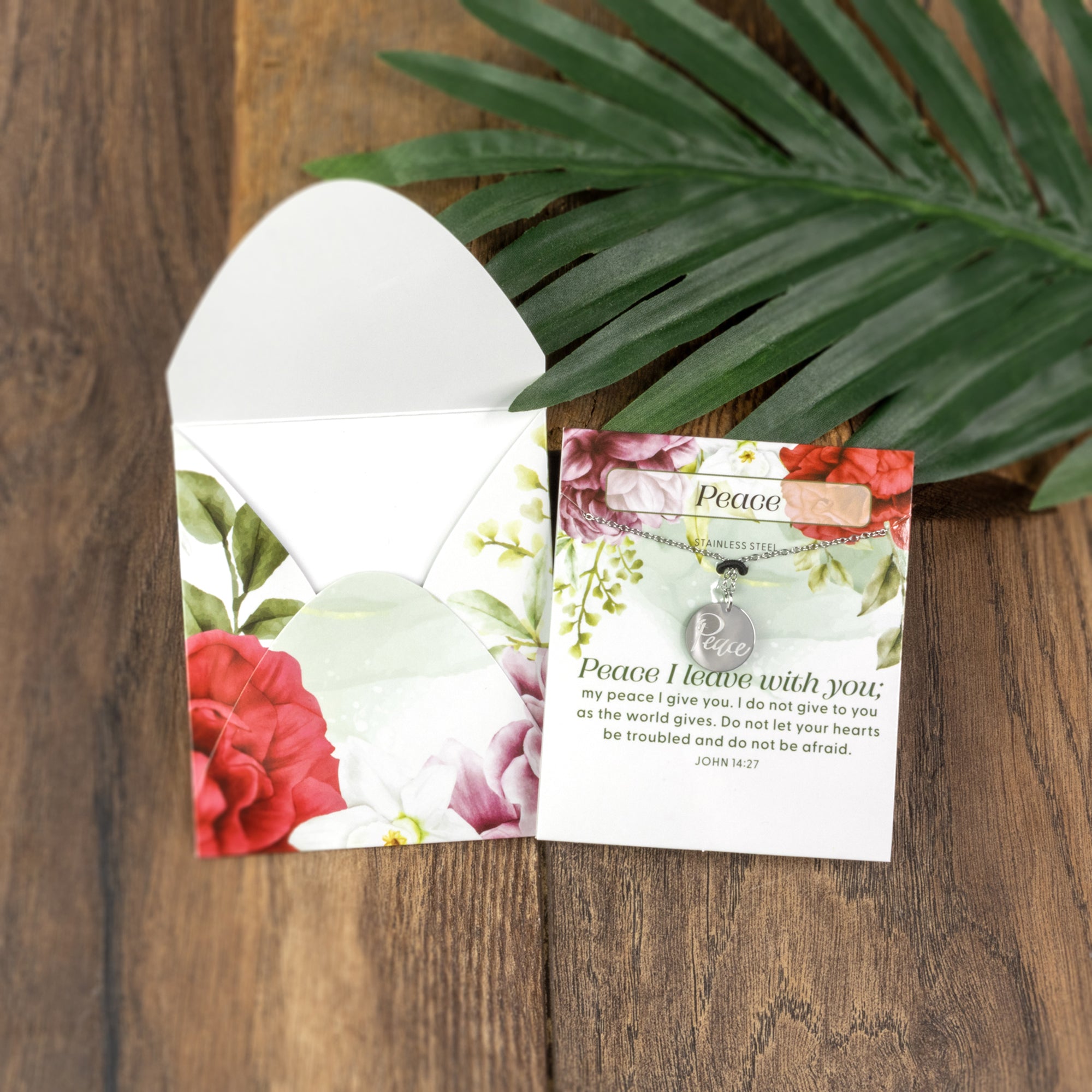 Pendant Front reads "Peace"; Pendant Back reads "John 14:27"