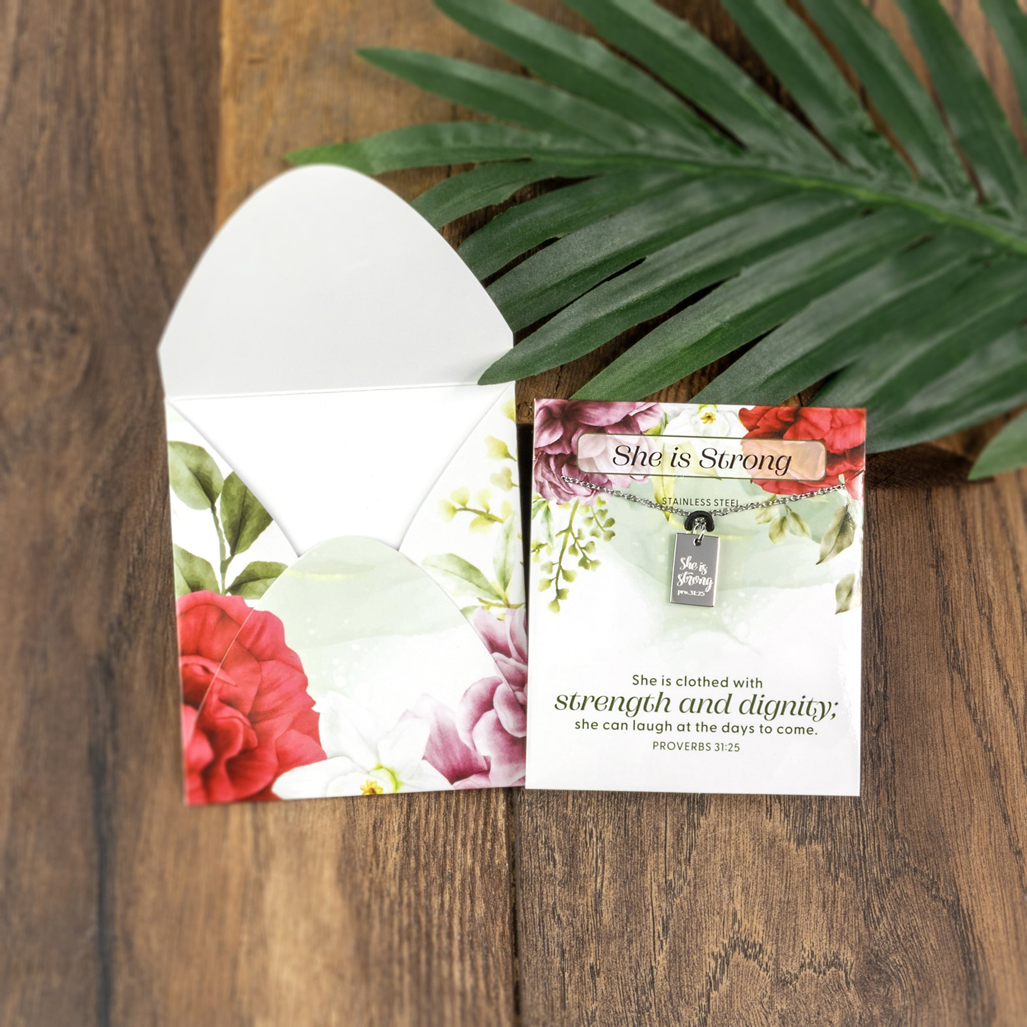 She is Strong Stainless Steel Tag Pendant with Card - Proverbs 31:25